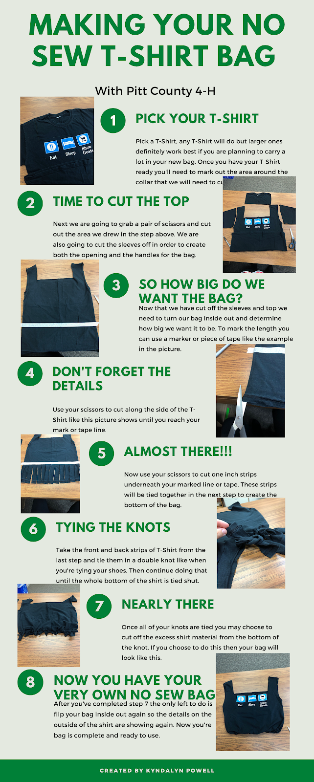 Are you looking for something fun to do this summer, but it doesn’t require a lot of materials and it can be used for different purposes? All you’ll need is a pair of scissors and an old t-shirt. We can create a no sew tote bag. You can use this tote bag during your grocery store run or your stop at the farmers market or whatever other option you have to be plastic bag free. This activity was created by Pitt County 4-H’s 2020 Summer Intern Kyndalyn Powell.